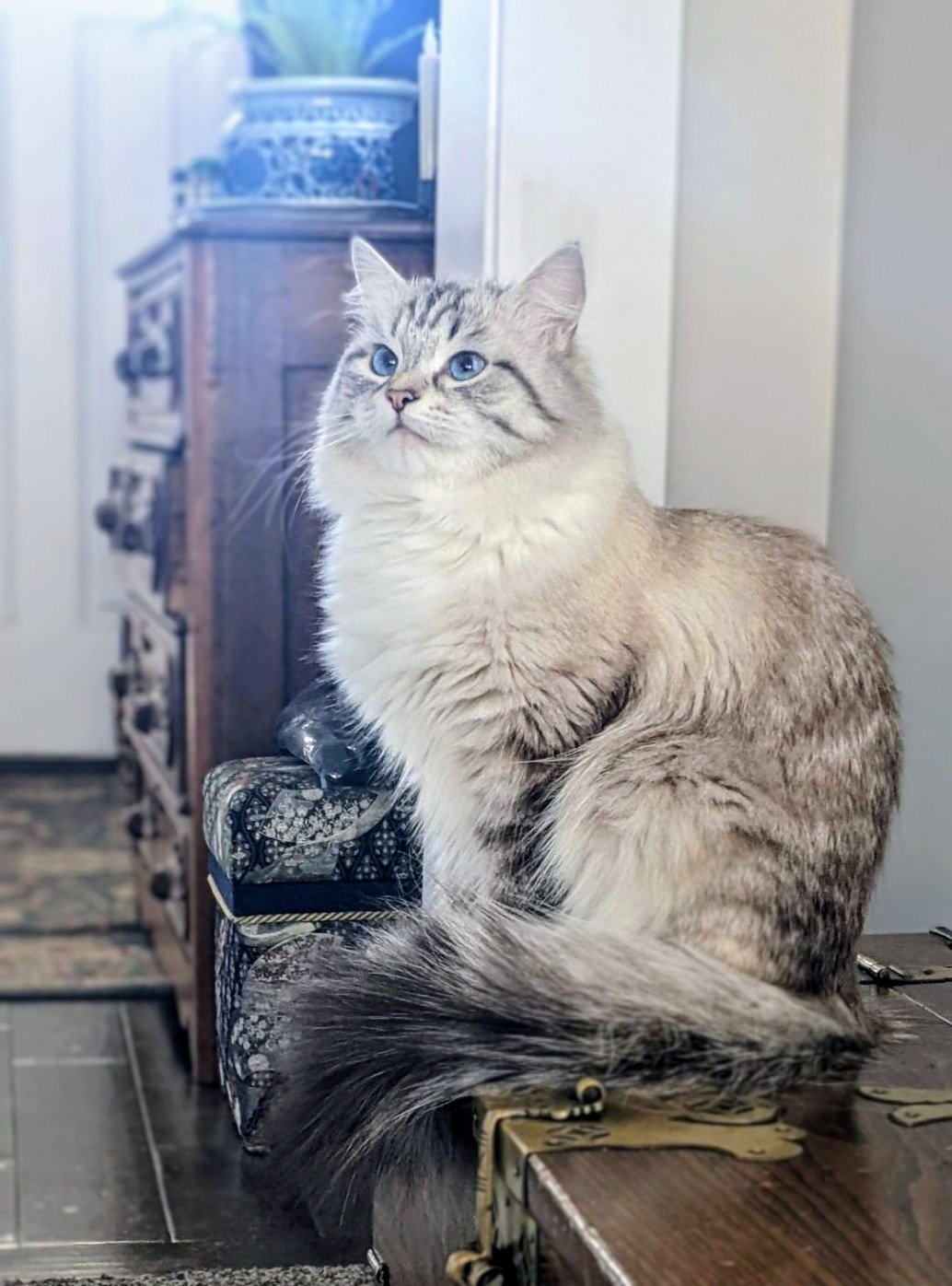 Saoirse is bonded with our household but especially to our youngest son Christian and competes with Colby for Christian’s attention. She is the queenly cat of our household who loves to perch on our highest shelf to survey our home watching her cat siblings and our family of children and grandchildren visiting often.